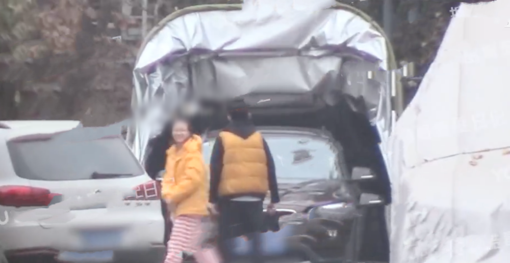 这次该神秘男子并没有来接焦俊艳,她不得不自己打车离开,等到某处后才与神秘男子会合。有意思的是,该神秘男子与焦俊艳穿着同款羽绒马甲。该男子很贴心地帮焦俊艳将行李放到后备箱,之后二人便一起驾车回家了。