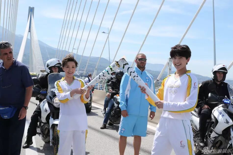 在希腊里永·安蒂里永大桥上,中国火炬手杨洋、郭采洁、郭川和蒋立章在火炬传递中。 他们在圣城雅典向世界传递着中国健康、阳光、热爱和平和敢于拼搏的正能量。祝愿里约圣火传递活动圆满成功!