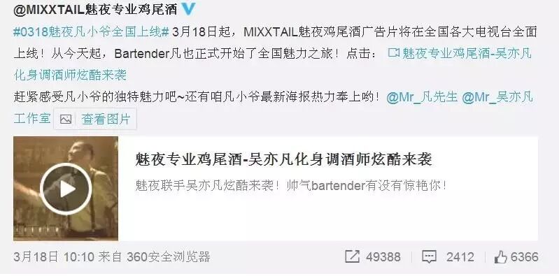 3月18日起凡凡代言的百威MIXXTAIL魅夜鸡尾酒广告片会在全国各大电视台全面上线!届时,妮妮们记得多多注意电视上面的广告啊,Bartender凡也要正式开始全国魅力之旅啦~