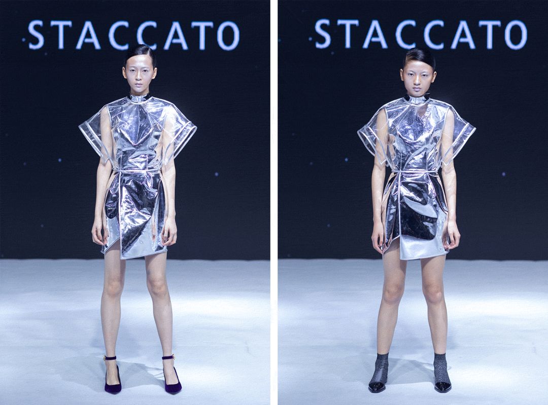 STACCATO系列则多了些许科幻的感觉。设计师将星际未来与超现实主义融入到新季设计,表现出现代年轻女性无畏规则的自信态度。突出了品牌“Everywhere is my runway”的理念。