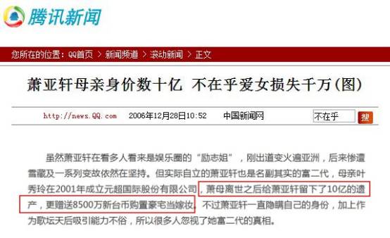 萧亚轩的妈妈生前是台湾著名半导体公司的大Boss,去世后给她留下了近10亿的财产。