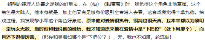 黎明突然高调宣布和她再婚了?说好的“婚姻是爱情坟墓”呢? 美人葺居 港台男星 2021-08-01 00:01:39 886 创作不易,用心坚持,欢迎请BaGua喝几杯爱心咖啡!打赏并支持本文 打赏并删除本文 本文由Miss影视圈(ID:himissysq)授权转载,作者:麦兜说起四大天王,总感觉是上个世纪的事儿。但最近,这波回忆杀又带着不同画风再次来袭。先呢,是网友祝福张学友迎来60岁生日引感慨;接着郭富城因为媳妇带俩娃坐经济舱、自己却坐头等舱被骂上热搜;再然后是刘德华入驻微信视频号,庆祝出道40年获赞励志刷屏。可能你也发现了,咦~怎么只有黎明静悄悄?他现在啥情况啊?其实黎明最近蛮忙,在红馆连开了9场暑期演唱会。原以为最不喜欢刷存在感的他无心上热搜,可到最后一场他却憋了个大招:不仅罕见聊起婚姻话题,还明确表示“婚姻是男人的坟墓”。结果可想而知,不仅成功引起大家注意,还顺便带来了大家最感兴趣的话题。那天台上,黎明仿佛有点欲言又止又心情复杂。先是借朋友老婆之口,突然像洞穿世事一样发出肺腑之言,认为“婚姻关系中,亲情是内围,两人必须要相互珍惜彼此。”接着他又一人饰演两角突然转移话题:“刚的黎明入了棺木(踏入婚姻生活的墓葬),由我替代他走出去,唱首《情缘送给大家》”,弄的大家莫名其妙。黎明今年55岁了,已奔知天命的年纪,可却是四大天王中情路最坎坷,当爹最迟的一个人。2012年和乐基儿离婚后一直单身让人唏嘘,沉寂6年,在52岁才与二婚女助理阿Wing恋爱升級当爹,又令人错愕。那会儿,八卦娱记把阿Wing描述成会来事的心机女,趁虚而入带球上位。前不久看毛尖的演讲调侃国产影视剧“按地位,财产分配颜值,按颜值分配道德和未来”,提到的现象恰巧与娱记笔下的阿Wing形象如出一辙:“一群妃嫔中,如果有一个是心机婊,你查一下她们的出身,八九不离十,做坏事的肯定是从底层爬上来的。《上阳赋》里,上阳公主万全万美,上能治国,下能安家,各族男人都爱她,唯独身边侍女要陷害她,各种动机紊乱的陷害,没什么理由,就出身不好。”很多网友,也对这位办公室恋情成功晋级的天王嫂颇有非议,黎明那会儿反倒越发低调,只发了一条轻声轻语的微博,所以一直被认为没给对方名分,对这段感情也有所保留。这次台上话中有话,难免不被歌迷猜测:莫非真官宣再婚了?还是阿Wing吗?其实我到觉得,早前有传两人已于2019年登记结婚的消息可信度挺高。黎明从来就不是一个高调的人,相反非常传统。对比四大天王各不相同的择偶观,仔细分析,其实也饶有意思。2017年,金星请到黎明做客自己的节目,入座时指了俩位子说:“一个坐了生孩子、一个坐了结婚,你自己选吧。”离婚单身的黎明,毫不犹豫的选了“结婚”那个座位。可见天王也是个渴望家庭的正常人。金星当时从前车之鉴预言他再婚难度大,没想到黎明在节目里,大方公开了自己的择偶标准:1、个头高矮都不重要,无所谓胖瘦,因为总有一天会胖的。2、不要西方人了,因为西方人太喜欢离婚了。3、对感情不强求,适合自己最重要,缘分到了一定会好好珍惜。一年后他就和助理传出了恋情。在公开的各路消息里,抛开各种黑料不说,阿Wing的人设核心是“低调”“好性格”,而这恰恰符合黎明最看重的“陪伴价值”。尤其是2014年黎明父亲去世之后,正是身为助理的阿Wing,天天陪在黎明身边度过悲痛时光。有时候来的再早,不如来的刚刚巧。天时地利人和,也对两人结缘帮衬了不少。黎明是一个花心的人吗?在面对电影《甜蜜蜜》主角黎小军一脚踏两条船,黎明一针见血的指出:“这样的男人注定失败。”导演陈可辛也公开表示过,他认识的黎明很纯真。曾以为他的外型,会是那种在爱情里玩票不负责任性格,可现实中却常常在爱情里处下风,而且下得很厉害。这点在前妻乐基儿身上是得到验证的。恋爱婚姻中的他和郭天王相比,那可是绝对有诚意。646万的玛莎拉蒂,1000万的宾利、4000万的游艇随便送。甚至专门为她花76万买下名字的缩写“GIA”当车牌;此外据说还有6处在旧金山的房产,以及近5亿的物业和2亿现金。但大方在物质上慷慨的他,当然也在乎另一半的对等付出。不是钱,而是希望能成为符合他心中期许的理想妻子。对此,外界一度传闻婚礼黎明给乐基儿下了五不指令:“不省钱”、“不高调”、“不泡夜店”、“不接工作”、“不性感”。乐基儿婚后不再接受访问,不再登台走秀,昔日着装性感的她穿衣风格变得日趋保守,就连身上的多处刺青也尽可能洗去。可这些对于一个从小在美国长大,性格独立开放的乐基儿来说,显然很难坚持。用乐基儿好友后来的话形总结乐基儿的痛苦:Gaile不喜欢老公什么都管,交什么朋友要管,逛街、出去见人也要管,连接什么工作都要管。”乐基儿在美国的亲友则向媒体透露,黎明与乐基儿根本就是不同世界的人。更客观的现实是,乐基儿和黎明相识时20岁,恋爱8年结婚4年,离婚时32岁。12年时间,足够让一个小女孩长成大女人。而成熟的标志无关物质,更重要的是心智:懂得自己真正适合的,并敢于取舍。两人最终分手,原因也的确是“双方因为生活理念不合”。黎明的传统与保守,与原生家庭成长经历不无关联。黎明老爸是印尼华侨家境不错,去北大留学时认识了黎明妈妈。婚后不就黎明父亲就去香港发展,母亲则留在北京。两地分居感情不和,在鲜少的报道中,一种说法是