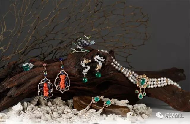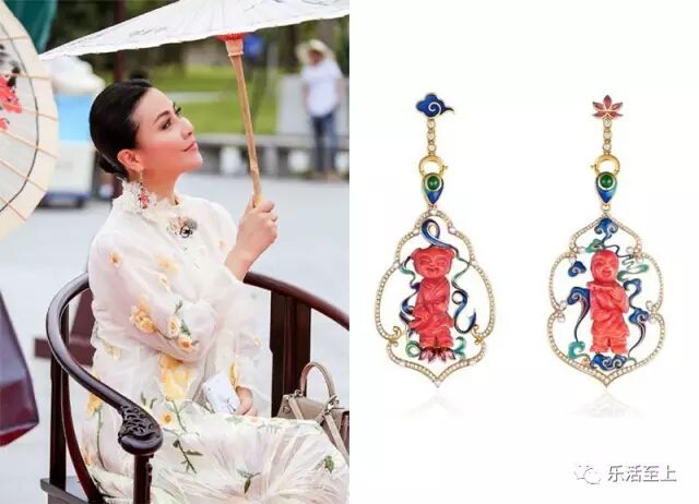 珐琅钻石珊瑚耳环正是点睛之笔。