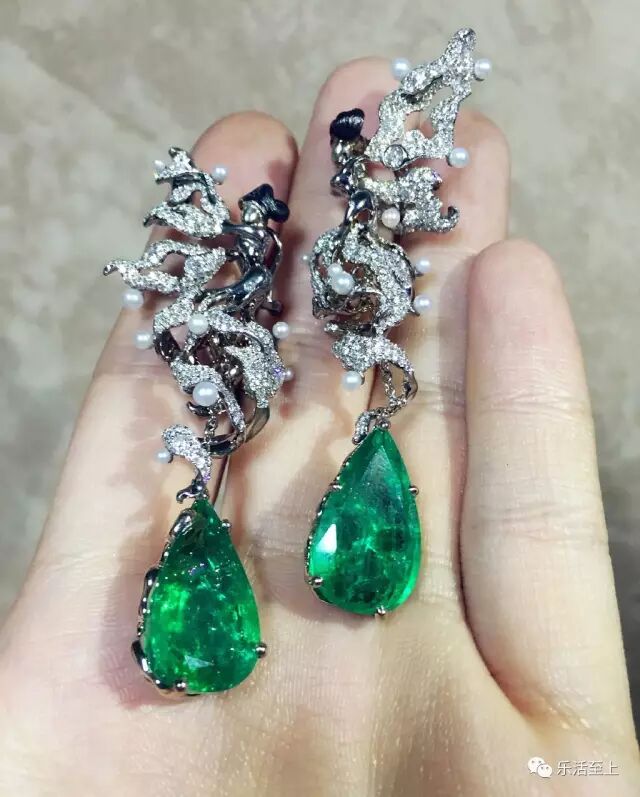360度不对称的飞天高定耳环,祖母绿镶钻