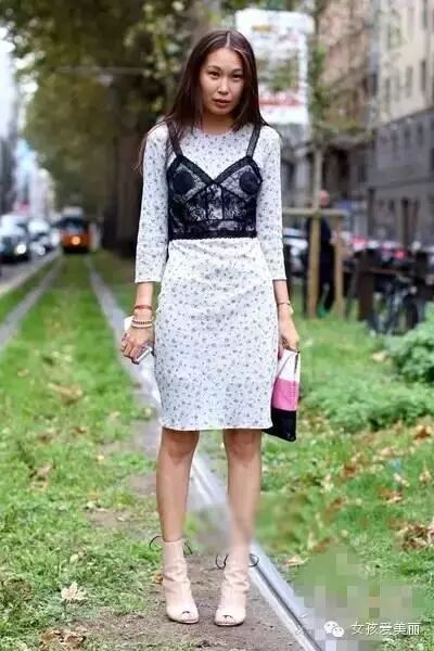 这款蕾丝材质的内衣,内搭一件长袖碎花裙,十分新潮的搭配,不再是局限的碎花裙外穿,很有街头时髦感。