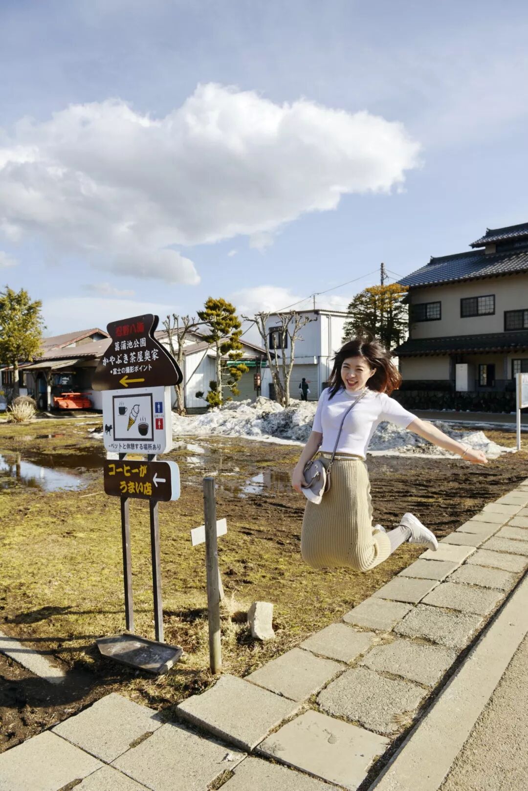 白色T,米色半裙,森系的搭配很适合日本的小镇哇。小编也好想出去玩~
