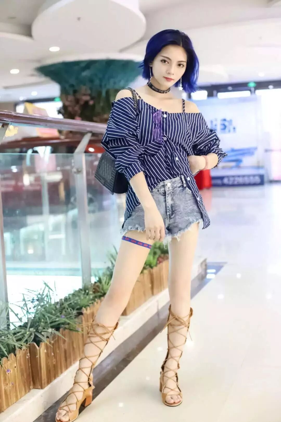 这是本期投稿里最酷的girl,蓝色一字领条纹衬衫,搭配灰色短裤,和蓝色的头发很相衬。绑带罗马鞋拉伸了腿部线条,小饰品的搭配也很用心呢。