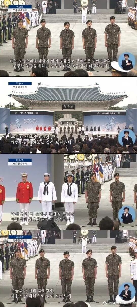今日为韩国纪念烈士的显忠日,在军队服役的部分艺人也参与了今日上午举行的第64届显忠日纪念仪式。目前正在服役的演员金玟锡、盛骏、BTOB李昌燮、B1A4申东佑以及VIXX车学沇一同参与了宣誓和国歌的演唱,几位艺人看起来都比入伍前消瘦精干了不少。