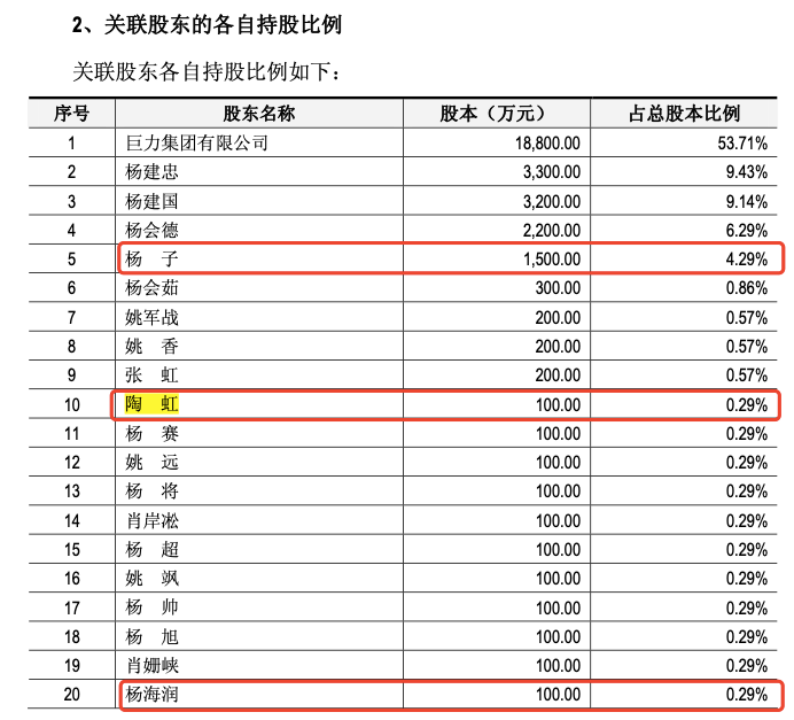 但在巨力索具2009年的《招股书》中,杨子的配偶为陶虹,两人还有一个女儿名为杨海润,陶虹、杨海润均在巨力索具持股0.29%。
