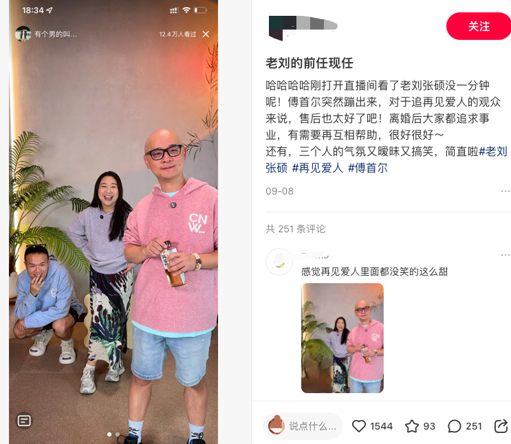 随后,《再见爱人3》的傅首尔、老刘在参加完综艺后离婚,老刘与另一位同样离婚了的男嘉宾张硕合租,组成新“离婚搭子”。如今老刘在抖音上拥有粉丝18.8万,小红书上拥有粉丝10万。今年7月,老刘和张硕在小红书首次开启带货直播,登上买手榜的第一名。