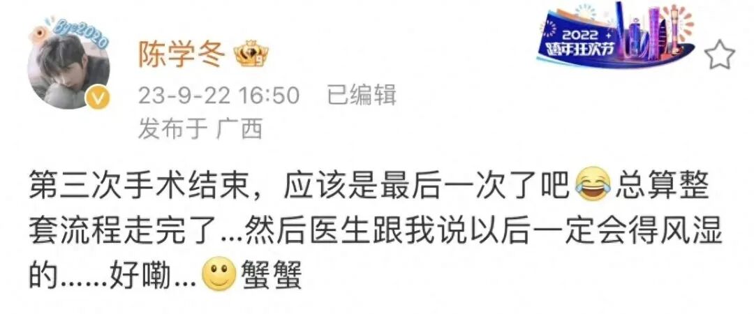 今天,陈学冬在社交平台上晒照称自己第三次手术结束,他发文说道:“第三次手术结束,应该是最后一次了吧,总算整套流程走完了…然后医生跟我说以后一定会得风湿的……好嘞…蟹蟹。这让粉丝们既心疼又庆幸。