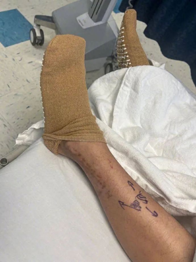 陈学东晒出的受伤的那只脚可以看出,陈学东的脚做了很大的手术,他小腿的两边都是孔洞和线条的伤疤,应该是打钢钉以及缝合的痕迹,另外腿上还画着标记,应该是医生为他做手术的示意图。