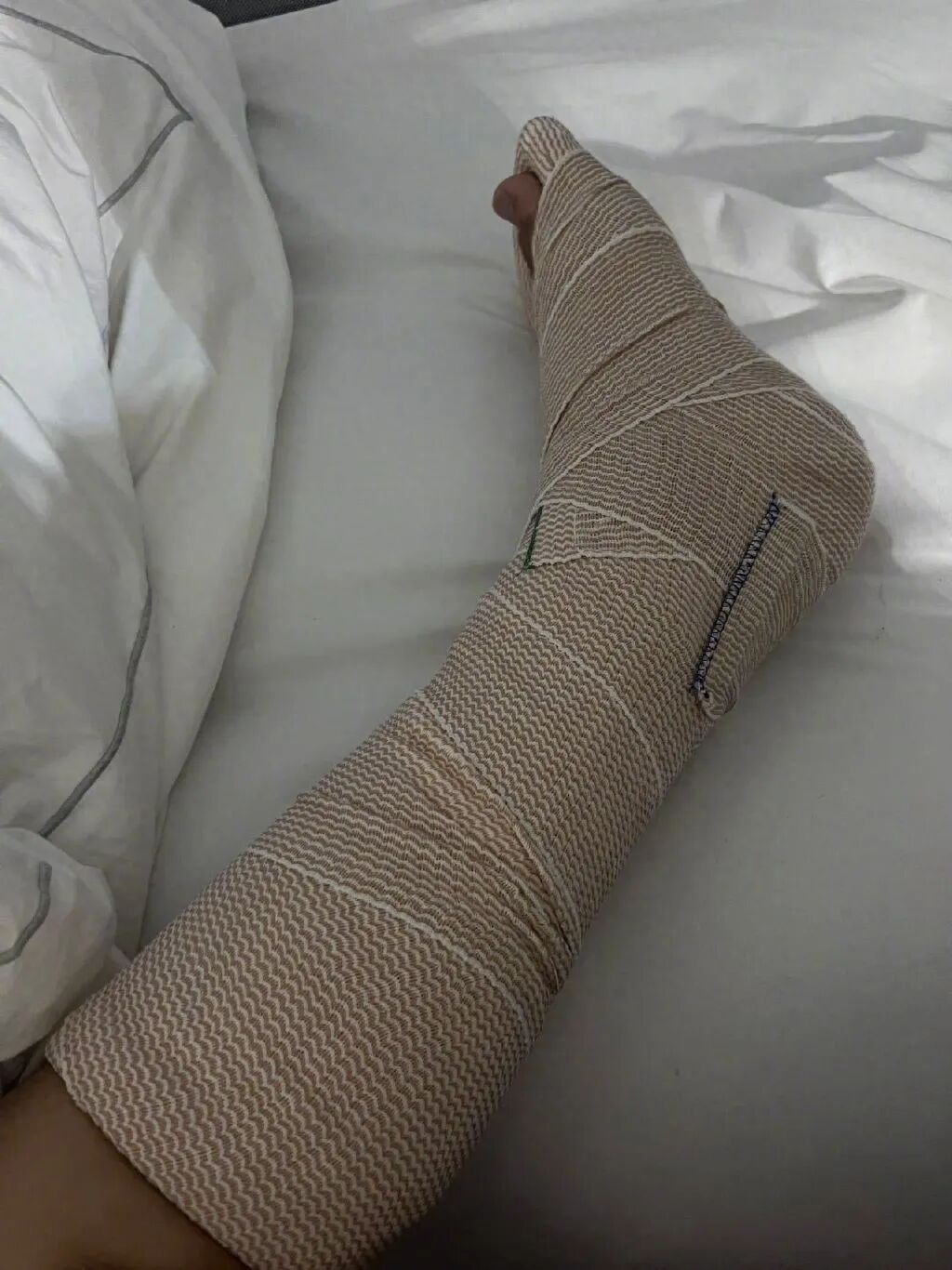 另一张照片则可以看到陈学东整只脚被绷带包住的画面,这应该是之前的样子了。不过,经过了前两次手术的他和医疗团队的不懈努力,他的恢复状况良好,已经逐渐恢复了信心和生活秩序。
