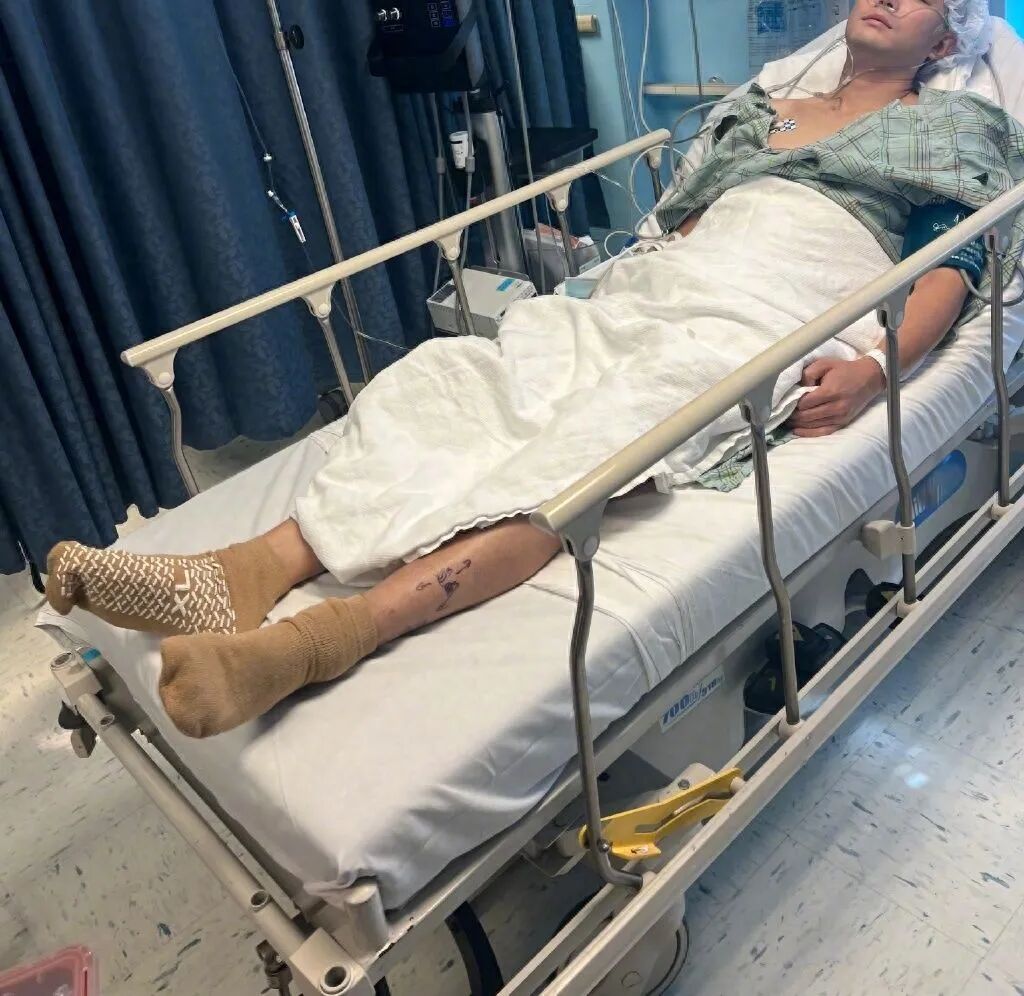 从陈学冬这次发布的照片中,我们可以看到他躺在病床上,面色有些苍白,衣服扯开面容憔悴,而他的双脚上似乎都绑着医院的特制医用袜子,一只脚上则满是伤疤,憔悴痛苦的模样实在让人心疼。