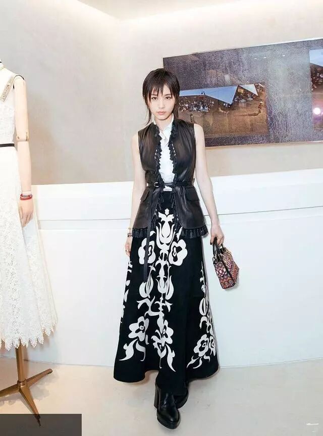 王子文身着皮质流苏马甲,黑色印花半身裙朋克范十足,干净利落的短发与极具设计感的首饰酷劲满分。好身材也是尽览无遗,不愧是“曲妖精”。