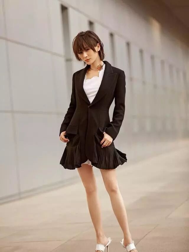 个性的西服,衣摆处荷叶边的设计,凸显小女人的气息,白色的高跟凉鞋和打底的白色连衣裙上下呼应,整体造型性感妩媚。