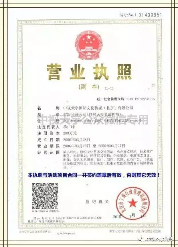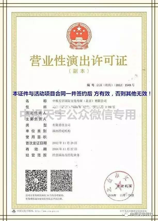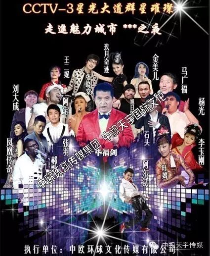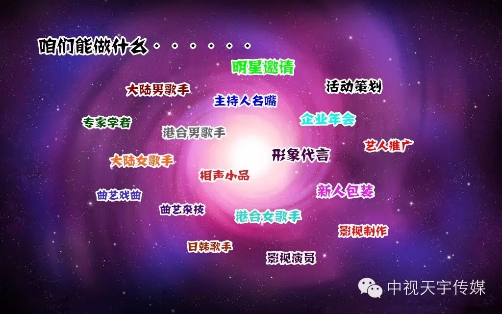 中视天宇国际传媒是中国文化演出联合会唯一演艺执行机构。由央视大型活动制作团队策划精英创办集广告、媒体传播、明星经纪、大型文体演出活动策划执行、企业形象包装为一体的综合型公司。掌控最新的明星出场费,最权威的的明星报价,最诚信的合作单位。