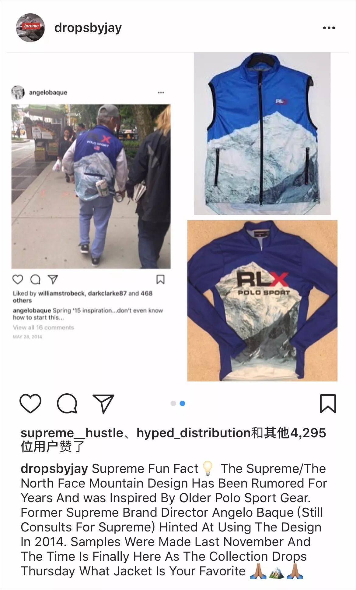 在 Supreme x THE NORTH FACE 2017 秋冬第二波单品正式发布之前,可能你已经看到过不少与雪山图案“撞脸”的其他品牌的设计了吧?也正是因此,许多人都在好奇这一系列的设计灵感到底取自于哪里。今日,情报账号 @dropsbyjay 给出了我们答案,据它透露,其实早在 2014 年 Supreme 前设计总监 Angelo Baque 就曾在自己的 Instagram 中暗示过这样的设计灵感,而在等待了这么久之后,我们才终于迎来了如今的正式发售。至于上面提到的灵感来源,你从上图已经看到了,其来自于 RALPH LAUREN 的运动支线 RLX 系列(前身是已经停产的 POLO SPORTS) 的一款单品,这样的结果,你猜得到吗?
