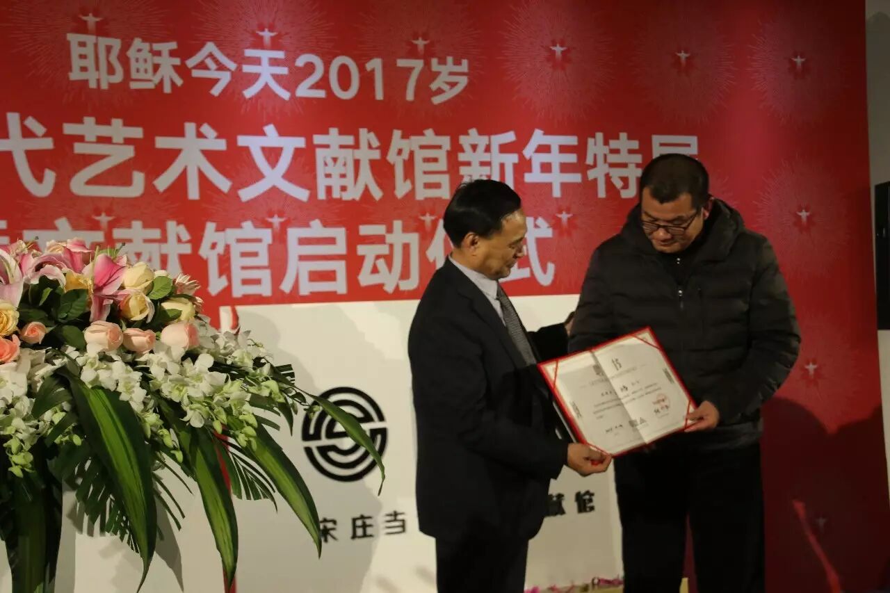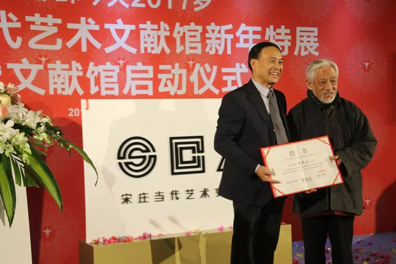 宋庄当代艺术文献馆馆长胡介报向栗宪庭颁发终身专家顾问聘书
