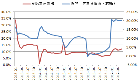 再从供应方面来看,上半年铝的产量增速亦是非常可观,上半年的产量增速达到了20%,当然这个数据跟去年上半年的基数也有很大关系,但最终毋庸置疑的是,今年上半年的产量增速仍然是比较大的。