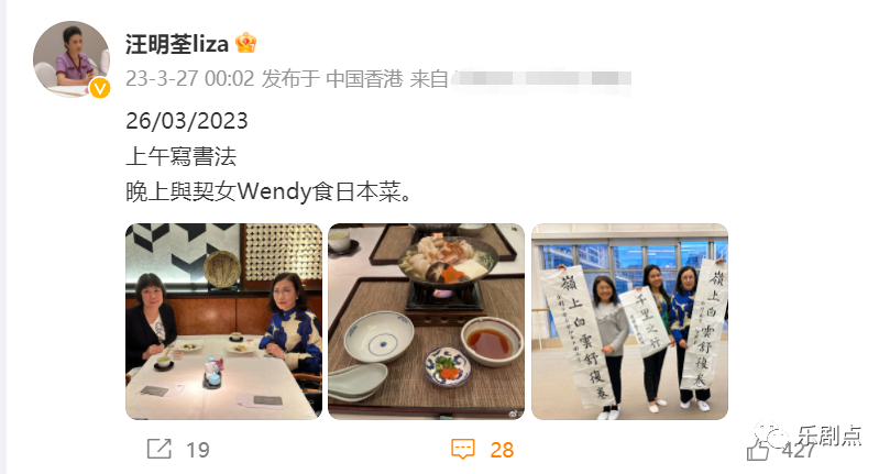 3月27日,亿万富婆汪明荃在个人社交账号上分享了一组聚会照,并配文称,上午写书法,晚上跟干女儿Wendy吃饭。