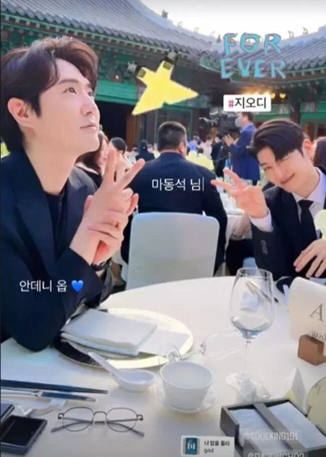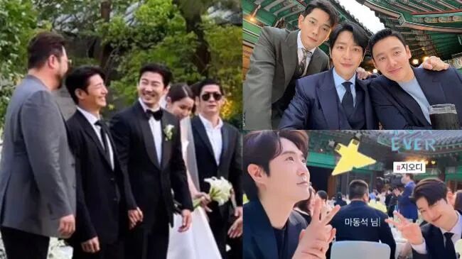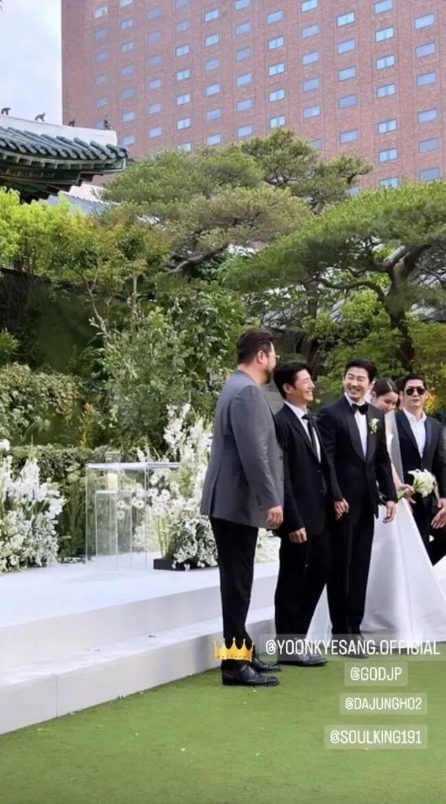 与尹启相合作电影《犯罪都市》的马东锡也带著从2016年开始公开恋爱的女友艺正花出席。g.o.d成员Danny安与孙昊永同坐一桌,后方中间那个硕大背影就是马东锡,艺正花坐在他旁边。据悉两人在仪式结束后留到宴会时段,亲自向两位新人表达祝贺。