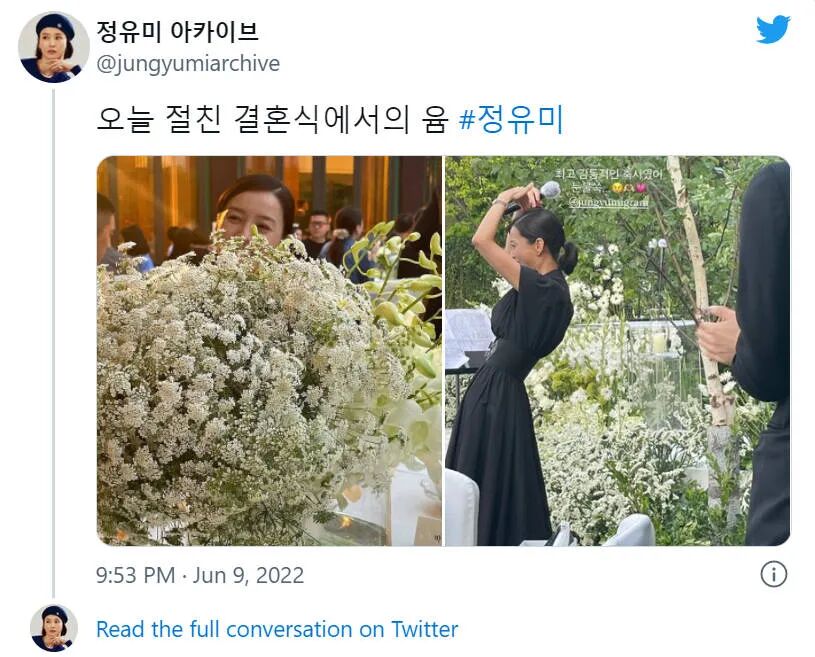 婚礼由尹启相的前师弟Rain担任司仪,队长朴俊亨为男方朗读祝贺词,女方则由郑有美朗读。据悉郑有美和新娘私交甚好,不时在IG上分享新娘家的宠物小柴「桌球」。宾客PO出郑有美读完祝贺词后双手比心的瞬间,留言说:「最让人感动的祝贺词,眼泪一下子就......」