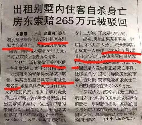 新闻中称由于乔任梁在租住的别墅里自杀导致房屋贬值,所以房主向乔任梁的前女友和亲属索赔了265.5万作为赔偿。至于为什么是他们俩,是因为租房合同是乔任梁的前女友以及乔任梁的上海户籍的表嫂签的。