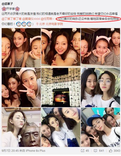 她们都是新生,大家都还是对未来的学习生活怀有美好期待。也像普通学生一样,室友之间形影不离,随时和室友自拍一下。比如开学典礼的时候,在网上分享照片,都还多正常。