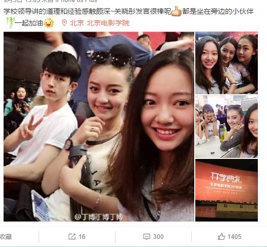 才开学就这样,很少合影,很不正常啊,难免让人猜测关晓彤不合群啦。幸好,在9月12号,北影新生军训的时候,终于看见关晓彤与室友的合影了啊。