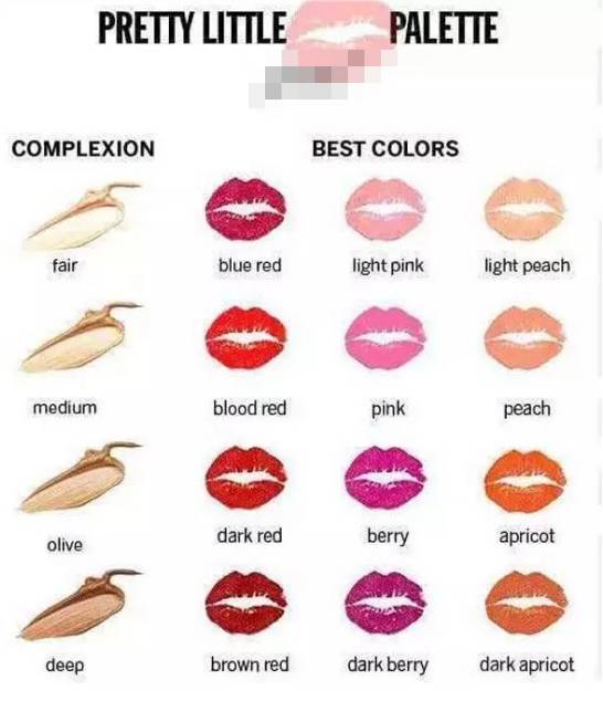 中国人选择粉色的唇膏一定没错,当然这个范围可以扩大到亚洲人,甚至南美人的小麦肤色。暖橘色、酒红色系或者姨妈红也很适合黄皮肤。切忌选择鲜艳的亮色和冷色系唇膏,会显得人气色不健康!