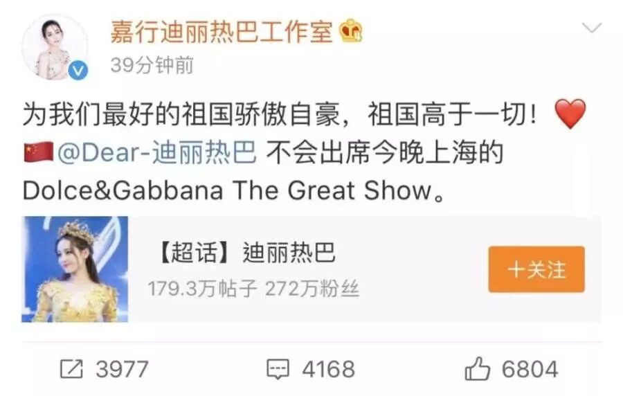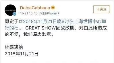 11月21日16时48分,意大利品牌杜嘉班纳(Dolce&Gabbana)通过官方微博发布消息称,原定今晚在上海举办的时尚秀TheGreatShow已取消。