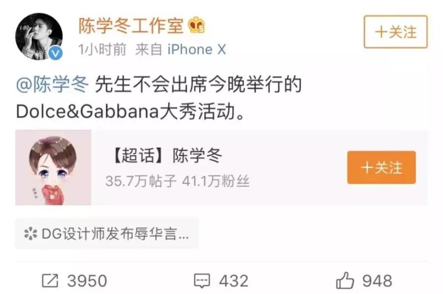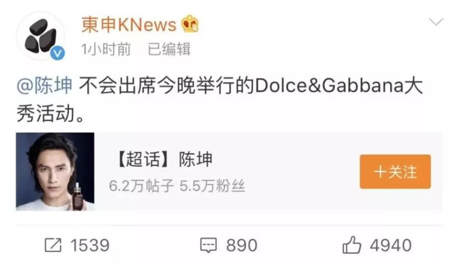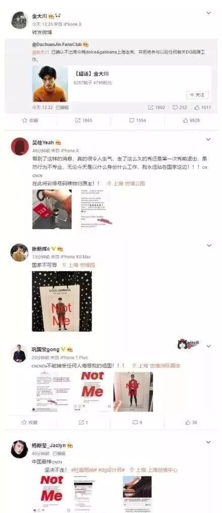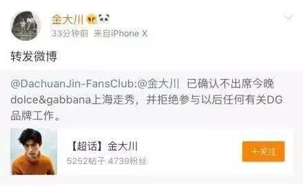 曾经多次为D&G走秀的金大川,在事发之后,第一时间表示:今晚不会出席,以后也不会了!!