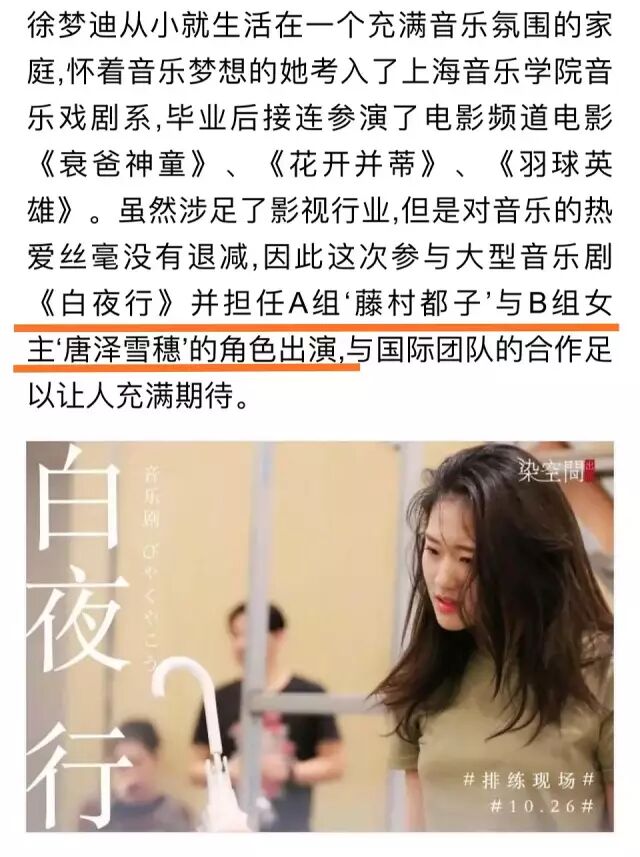 有位叫徐梦迪的演员,在本次《白夜行》的音乐剧中担任A组的“藤村都子”和B组的“唐泽雪穗”。