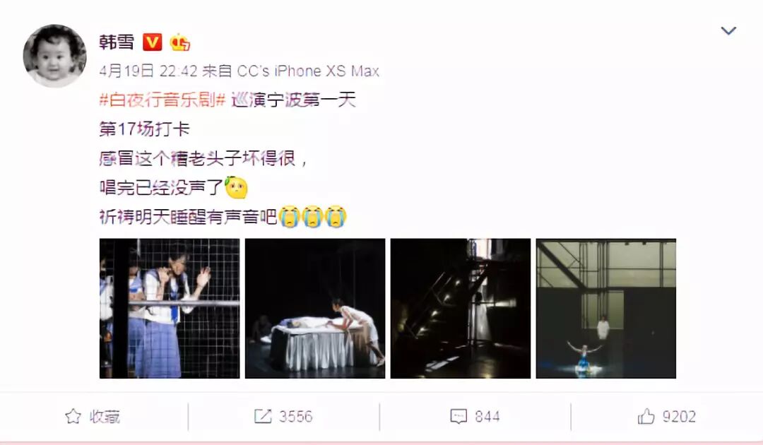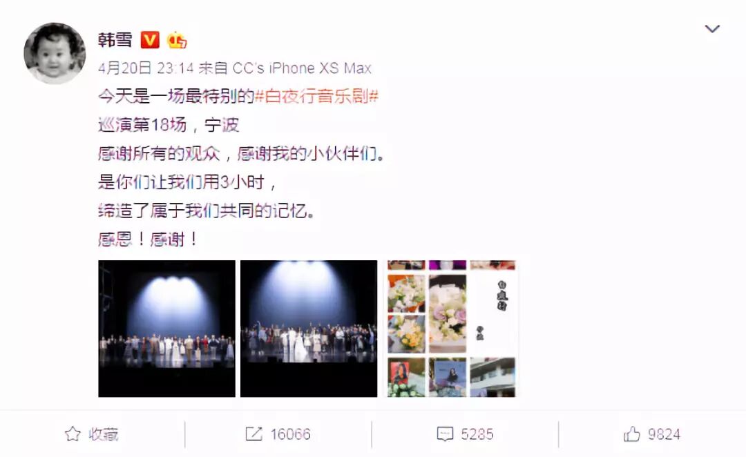 音乐剧放录音这种史诗级骚操作最初居然获得了现场观众的谅解(???),韩雪也被自己的敬业感动到了,她很兴奋地称这次骚操作为“最特别”的一场。