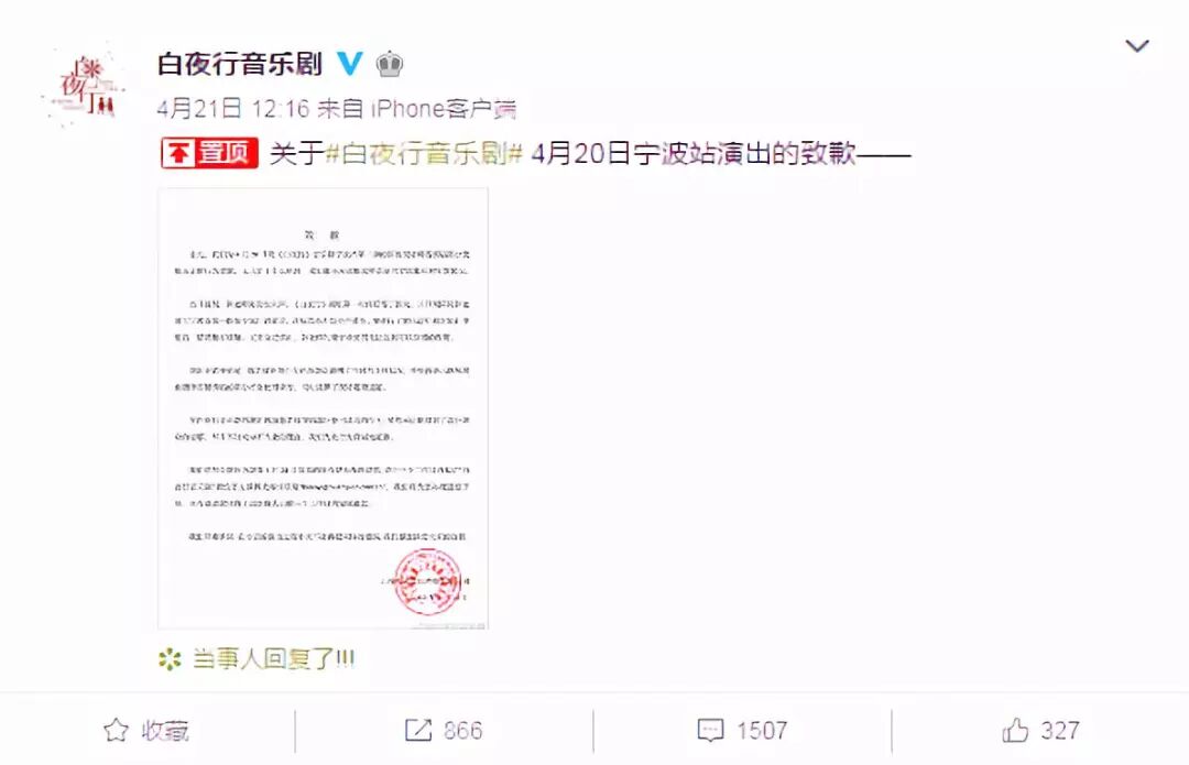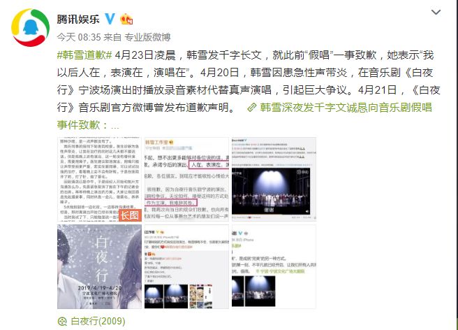 ▲4月23日凌晨,韩雪发千字长文,就此前“假唱”一事致歉,她表示“我以后人在,表演在,演唱在”。4月20日,韩雪因患急性声带炎,在音乐剧《白夜行》宁波场演出时播放录音素材代替真声演唱,引起巨大争议。