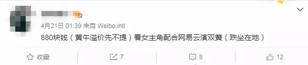演出结束后,某网友在微博上吐槽“880块钱(黄牛溢价先不提)看女主角配合网易云演双簧(跌坐在地) ”。