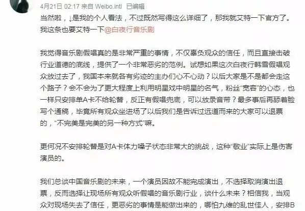 而韩雪这次在音乐剧表演现场公然假唱,事后还卖力营造敬业人设……这种世界首例史诗级丢脸行为,对刚刚走进观众视线的中国音乐剧绝对是一记重击。