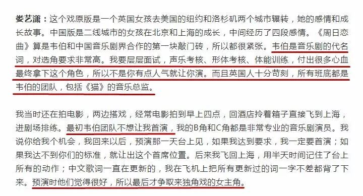 音乐剧专业出身的艺人娄艺潇,为了参演韦伯团队(《歌剧魅影》和《猫》都为韦伯改编)的《周日恋曲》,做了很多准备,也经过层层面试和多次严苛的考核。
