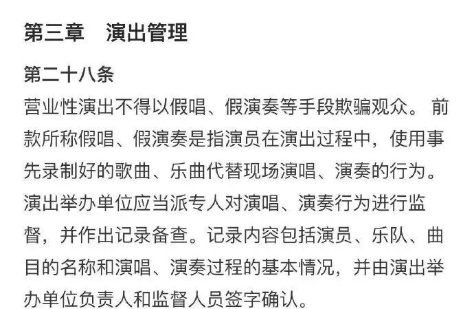 另外,早在2009年9月,文化部修订发布的《营业性演出管理条例实施细则》第三十一条就规定:营业性演出不得以假唱、假演奏等手段欺骗观众。
