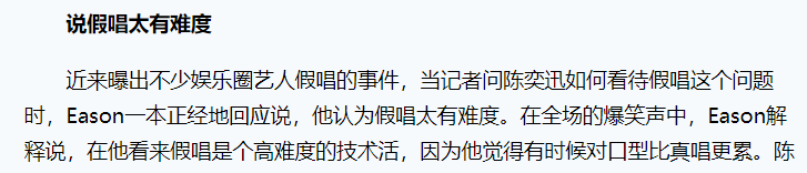 曾经有传媒就乐坛假唱现象采访陈奕迅,他说“假唱是高难度技术活,对口型比真唱更累”。