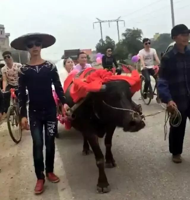 牛车、小车和自行车,各种交通工具都上阵了,整个接亲过程十分欢乐,这样的形式简直是开创了婚礼界的逗比流派。