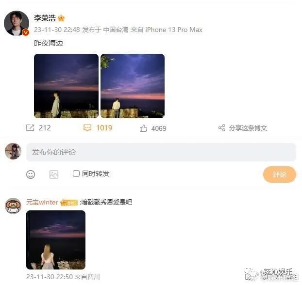 殊不知夫妻俩一前一后发文,被网友揪出在低调放闪,杨丞琳发出的15张照片中,有一张和李荣浩的海边夜景相同,让网友发现是「夫妻视角照」,让网友纷纷直呼:「暗戳戳秀恩爱」、「也太甜了」、「真夫妻就是好嗑」、「情侣头像有了」、「这狗粮大吃特吃也好开心」。