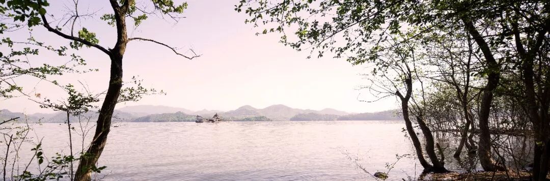我们去的时候,正值微雨的清晨,湖面有些氤氲的水气,远处山峦起伏,绵延不绝,像极了一幅淡淡的水墨画。
