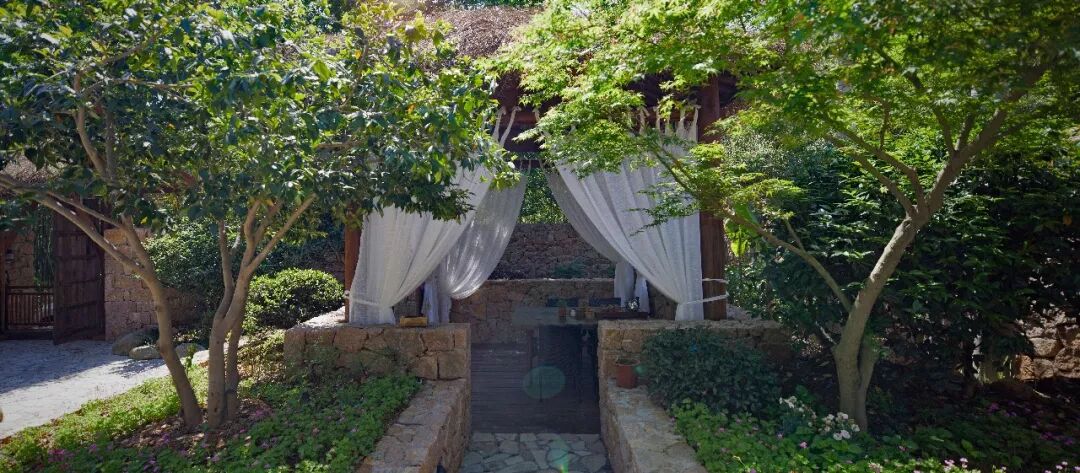 进门左侧有个东南亚风情的亭子,上面同样覆了厚厚的竹梢,野趣天成。