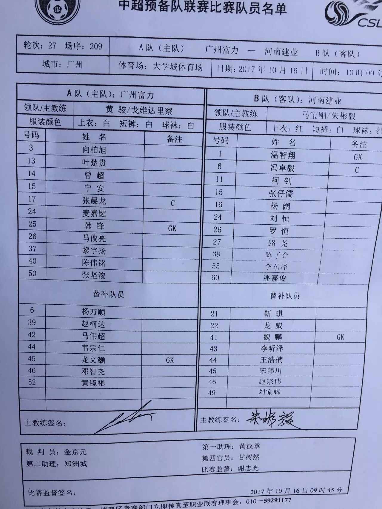 本场比赛,富力排出“新老结合”的阵容,韩锋、叶楚贵、曾超、向柏旭、张晨龙等一线队球员同预备队年轻小将联袂出战。建业方面也派出了富力旧将冯卓毅以及柯钊、杨阔等部分一线队主力球员。