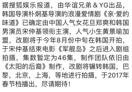 据知情人士透露,因热播韩剧《太阳的后裔》而爆红的宋仲基将携手郑爽共同代言某护肤品。而电视剧《亲爱的味道》也在确定宋仲基、郑爽出演男女主角。8月份正式开拍。