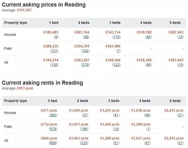 雷丁郊区的一房公寓平均房价为 £135,000,两房公寓为 £160,000。市中心靠近雷丁火车站的房价比郊区稍微贵了一些,一房公寓平均房价约 £200,000,两房公寓平均房价约 £300,000。