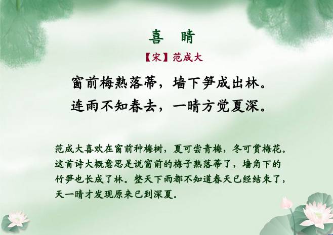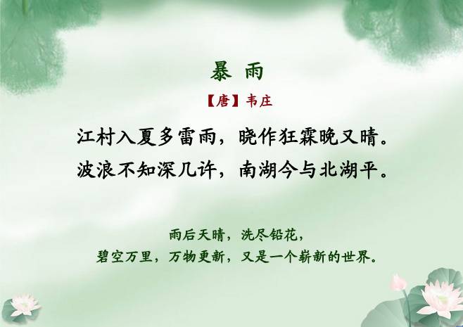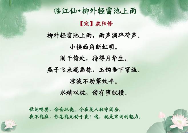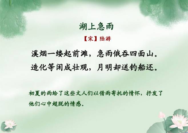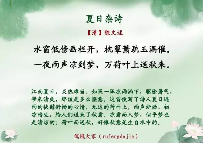 夏雨清风起,听荷绿正浓——夏雨诗词20首 儒风大家 内地男星 2016-07-11 05:42:30 453 创作不易,用心坚持,欢迎请BaGua喝几杯爱心咖啡!打赏并支持本文 打赏并删除本文 春雨湿冷,秋雨微寒,冬雨更是冷冽凄清。唯有夏天的雨清凉酷爽,烟雨迷蒙,最堪赏玩。夏日午后,或者傍晚,新雨初霁,荷叶滴翠。这时候最宜泡一壶茶,点一盏灯,在窗口读书。别的不看,只看唐诗宋词,看千年前的夏日烟雨飘飘洒洒的落进古人的诗里,唯美着后来一段又一段的时光。【儒风大家】编撰整理,转载本文须注明:来源:儒风大家(微信ID:rufengdajia)点击下方“阅读原文”直接报名 创作不易,用心坚持,欢迎请BaGua喝几杯爱心咖啡!打赏并支持本文 打赏并删除本文 感谢您的支持鼓励,我会继续努力的!文章地址:用户邮箱:打赏金额:USDT 请输入数字点击”去打赏“,即可进行打赏支持本文章哦 夏雨 About the Author 儒风大家 功能介绍:传承经典、经世致用,中国传统文化当代价值传承者。 Related Posts 夏雨清风起,听荷绿正浓——夏雨诗词20首 2016-07-11 05:42:30 发表评论