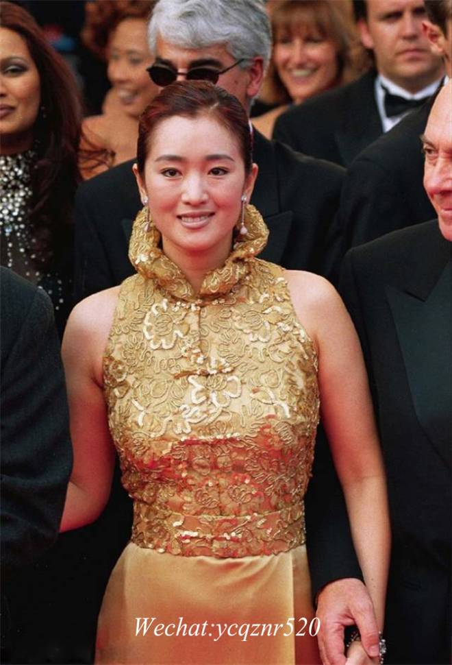 第九次:1999 《荆轲刺秦王》入围戛纳电影节主竞赛单元,巩俐身着金色中式改良礼裙气质亮相。女王气质初显。礼服上的花朵暗纹和中式结扣,无不宣扬着鲜明的中式优雅。▼